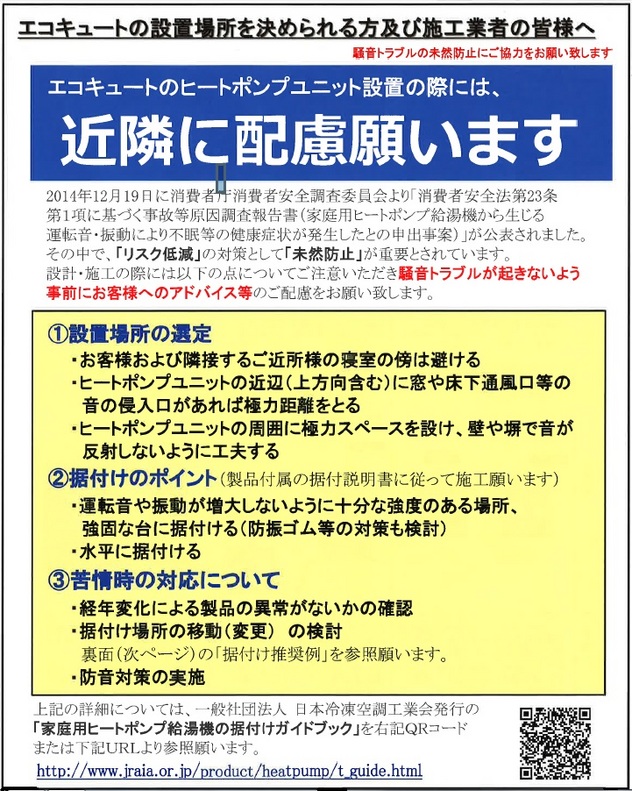 ヒートポンプ給湯機 設置に伴う 騒音苦情の防止 について